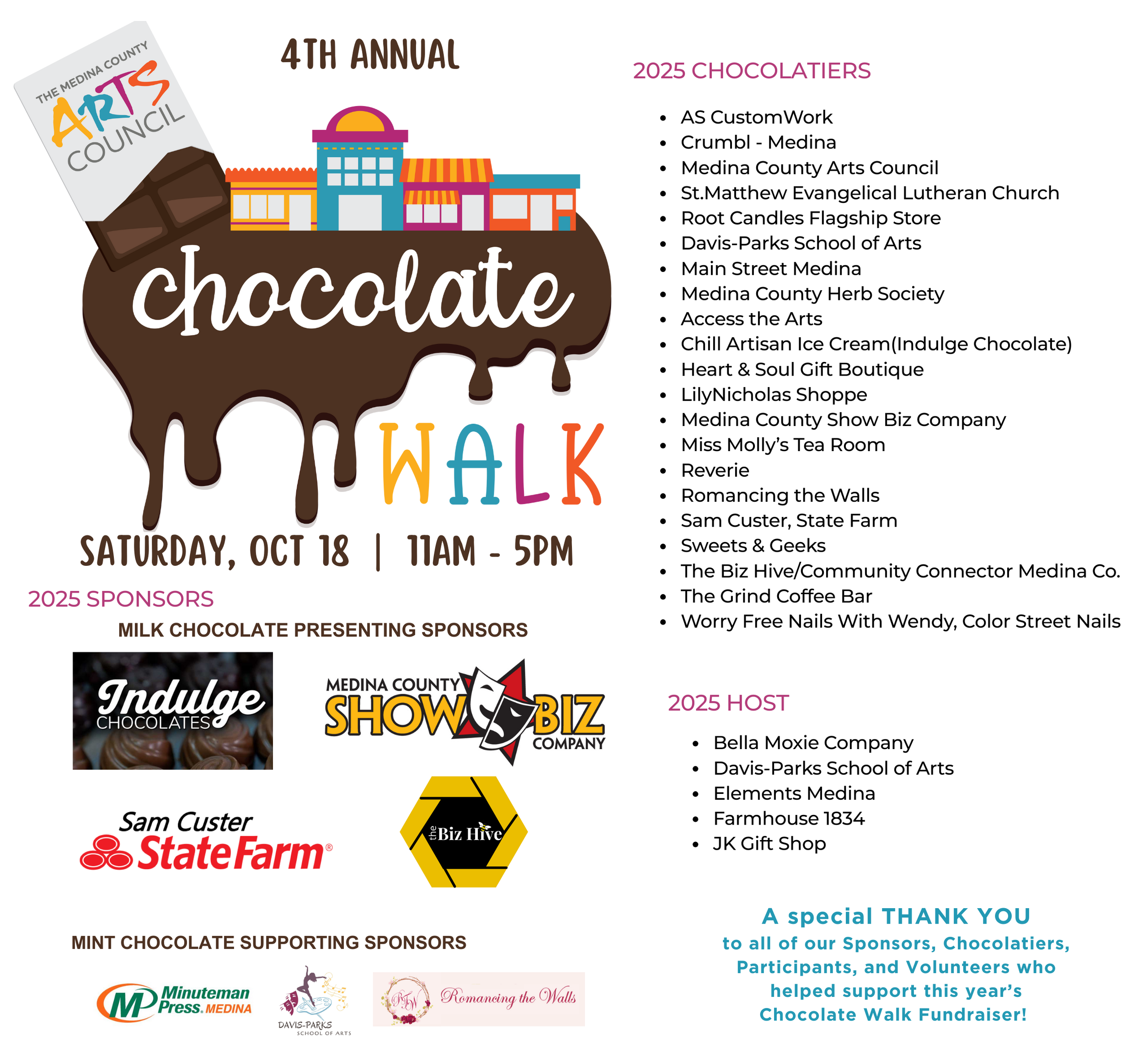 On behalf of the entire Medina County Arts Council board, we would like to extend our heartfelt gratitude for the community’s participation in our 4th Annual Chocolate Walk fundraising event on Oct 18th, 2025.