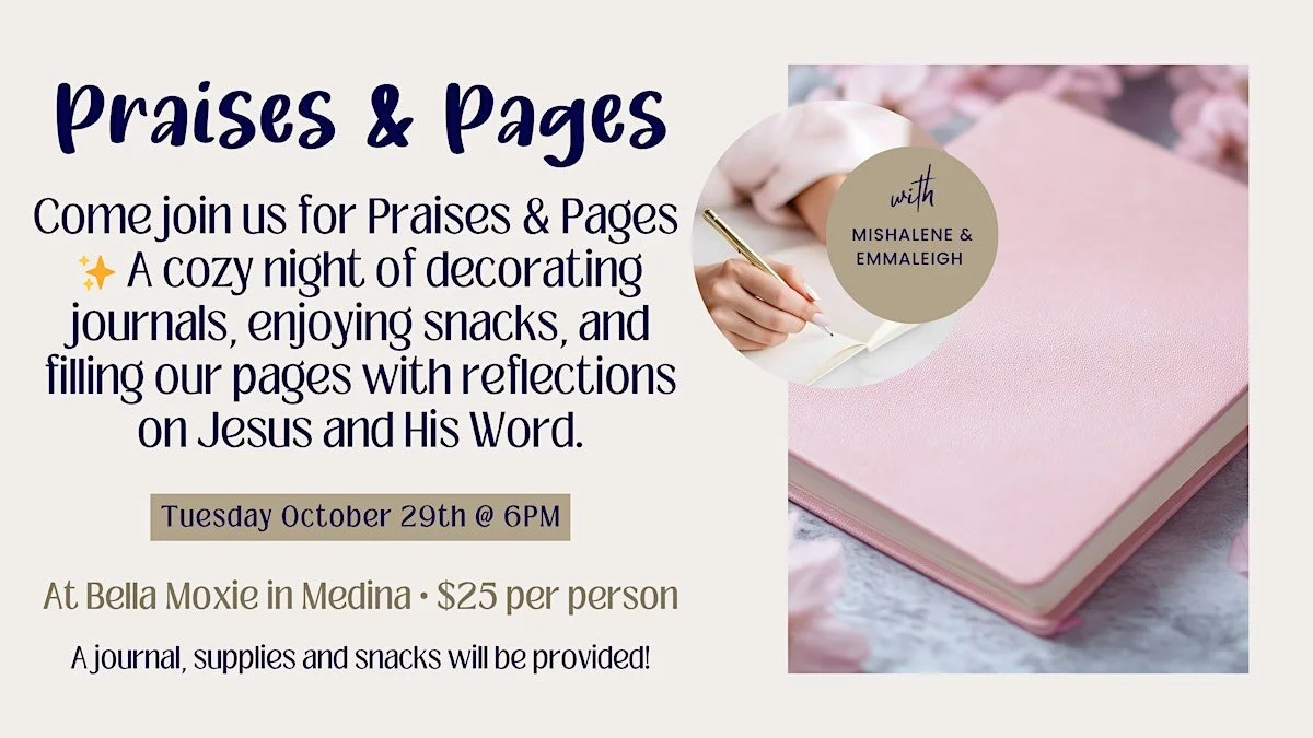 Join Praises & Pages - An Artistic Journey at Bella Moxie Company for a night filled with creativity and inspiration. This event is a celebration of art in all its forms - from reflection & praises to decoupage & painting your very own journal.